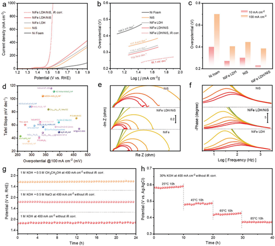 图3电化学测量:a)极化曲线,b)不同电极对应的Tafel图,c)不同电极的活性比较,d)最新的Ni-Fe基电催化剂,e)不同电压下Nyquist图和f) Bode相位图,g) NiFe LDH/NiS在不同电解质中400 mA.cm-2恒流密度下的计时电(CP)曲线,h) NiFe LDH/NiS在工业30% KOH电解质下,在不同温度下的CP曲线。
