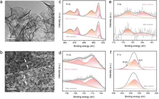 图4 OER试验后NiFe LDH/NiS的表征。a) TEM和b) HRTEM图像。c) Ni 2p,d) Fe 2p, e) S 2p和f) O 1s的高分辨率XPS光谱