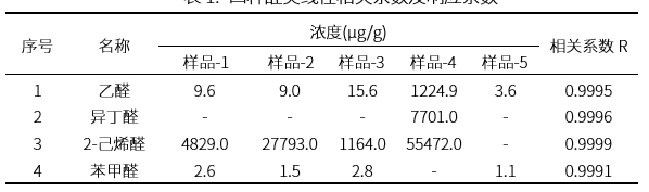 对其中检出率最高的乙醛、2-已烯醛、苯甲醛及异丁醛四种醛类物质建立外标曲线进一步测定。