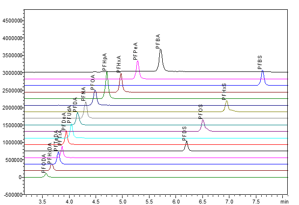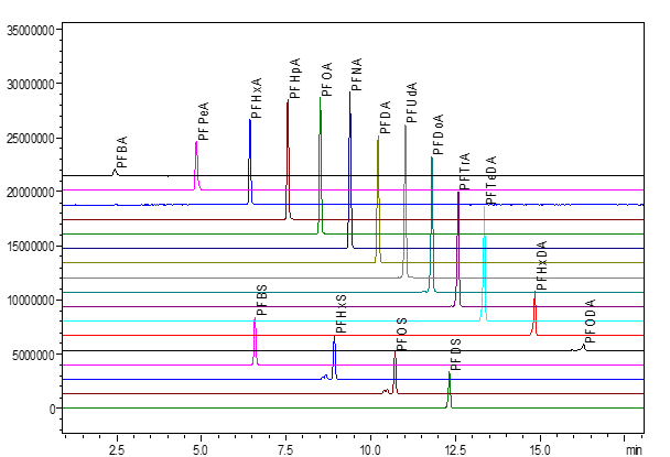 除了PFOS和PFOA这样含有8个碳的全氟磺酸和全氟羧酸外,超短链(C2-C3)、短链(C4-C7)和长链(C9-C18)的全氟烷基酸(PFAA)在环境和生物样品中也被广泛检测到。对于宽分子量分布的众多PFASs化合物来说,使用反相液相色谱串联质谱(RPLC-MS/MS)检测技术,不仅可以从复杂样品基体中高选择性的检测到PFASs,而且可以得到接近ppt水平的高灵敏度检测结果,因此RPLC-MS/MS目前成为了分析PFASs的主流工具。