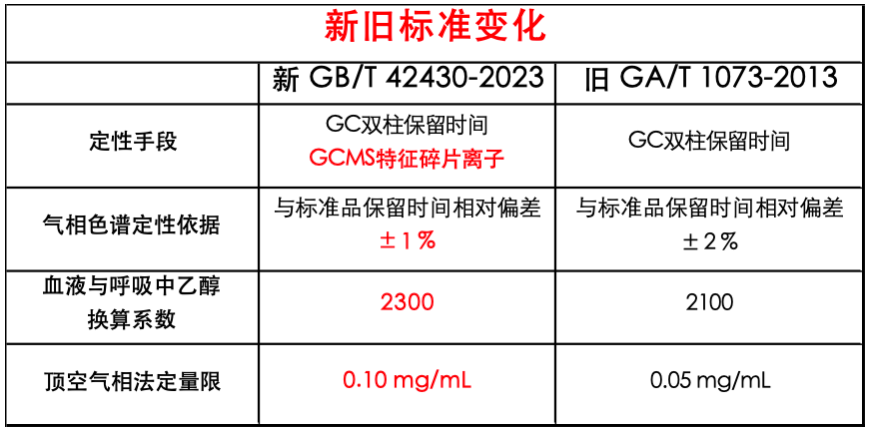 本次新标准相较旧标准有几处变化:定性方式增加,定性判据收紧,还根据中国人的体质和代谢特点调整了血液与呼吸中乙醇的换算系数,并对定量限进行了修正。详细变化内容参见下表1所列。