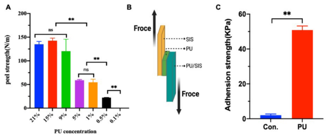 图3 (A)不同浓度PU乳液在SPS上的剥离强度,(B)重叠剪切试验示意图,(C)双层SPS复合材料的平均粘着剪切强度