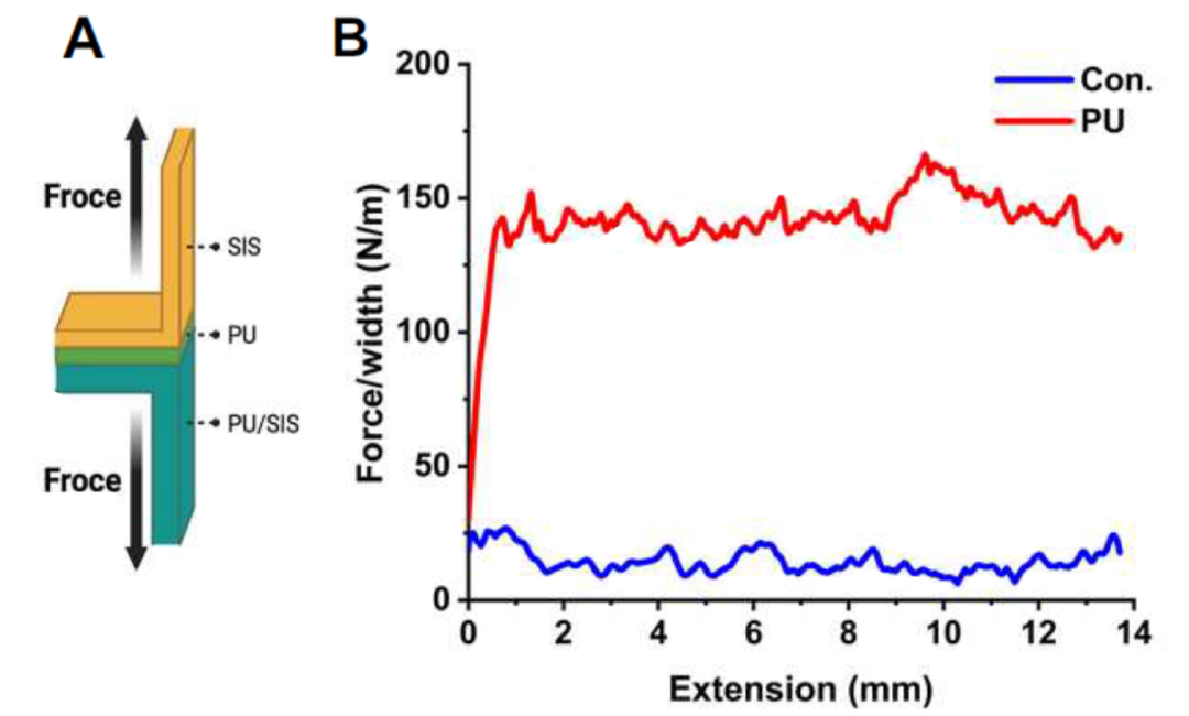 图4 (A)180°剥离试验示意图,(B)双层SPS复合材料剥离强度-位移曲线