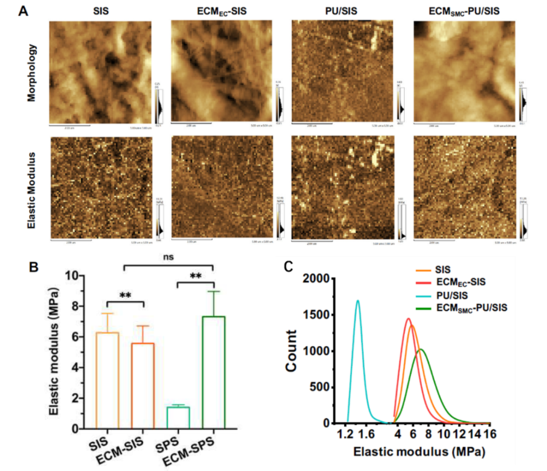 在生物实验中,选择子宫内膜上皮细胞(ECs)和平滑肌细胞(SMCs)作为功能细胞,在SPS支架表面构建组织特异性ECM,验证功能细胞衍生的ECM对组织功能再生的影响。为了对比观测SIS、ECMECs -SIS、PU/SIS和ECMSMCs -PU/SIS膜的形貌和力学性质,使用开云手机登录入口·(中国)官方网站SPM-9700HT的纳米物性分析软件(Nano 3D Mapping)进行表征,获得了四组样品同一区域的表面形貌图和弹性模量分布图(图6A),同时通过软件计算获得了它们的弹性模量,结果表明:ECMECs -SIS的弹性模量低于SIS,而ECMSMCs -PU/SIS的弹性模量高于PU/SIS。