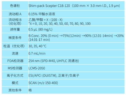 以0.15%甲酸水溶液作为水相,以乙腈/甲醇的混合溶剂作为有机相,进行梯度洗脱。通过改变有机流动相的组成比例和柱温箱温度,对每一个化合物的分离度进行了全面研究。具体优化项为:有机流动相中的乙腈比例以10%的增量从0%变化到100%(11种),柱温箱温度以5°℃的增量从30℃C变化到40℃C(3种)。