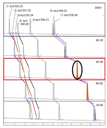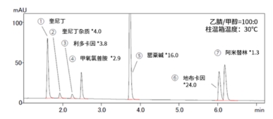 ①奎尼丁 ②奎尼丁杂质 ③利多卡因 ④甲氧氯普胺 ⑤罂粟碱 ⑥地布卡因 ⑦阿米替林图1 基于m/z信息的峰跟踪右上角为乙腈/甲醇比例,柱温为30°C如图1,化合物的保留时间随着有机相中的乙腈比例改变而变化,包含奎尼丁杂质在内的最多7种化合物被分离。值得注意的是,在60%乙腈的色谱图中(图1红色框出)只检测到5个峰,⑥/⑦被共洗脱,这些未分两种杂质组合②/③、离的峰很容易被忽视,LabSolutions MD以“橙色”突出标记共流出峰(图 1黑色圆圈)它还为共流出化合物分别提供 m/z,轻松了解是哪些化合物未分离。
