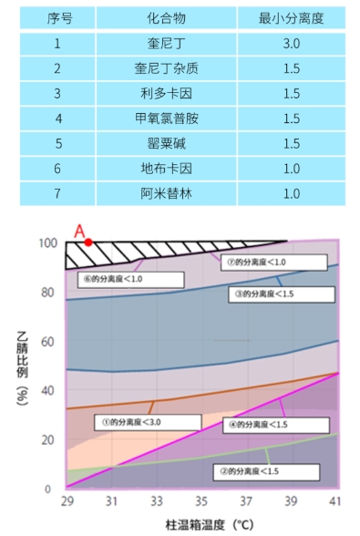 纵轴表示有机流动相中的乙腈比例,横轴表示柱温箱温度。具有较高乙腈比例和较低柱温箱温度(图3中的A点)的条件有望提供最佳分离效果。