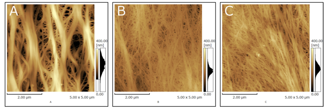 以上三张图片是用原子力显微镜对不同制作工艺的隔膜材料进行成像的图。范围为5μm×5μm。因为原子力显微镜获得的形貌图像为三维图像,因此隔膜多孔结构可被很显著地表现出来。