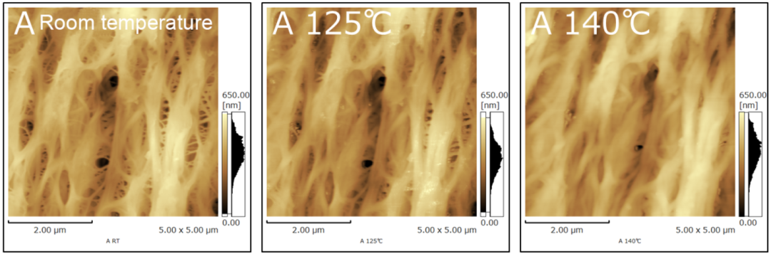 开云手机登录入口·(中国)官方网站原子力显微镜具备完善的环境控制功能。使用样品加热单元从室温梯度加热到125°C和140°C,并观察其表面形状。范围为5μm×5μm。随着温度的升高,可以看到由于隔膜熔化,孔隙逐渐收缩。对于该实验,使用开云手机登录入口·(中国)官方网站专门设计的环境控制舱既可以在真空环境下进行,也可以完全模拟锂电池内部的温度/湿度/电化学环境进行。