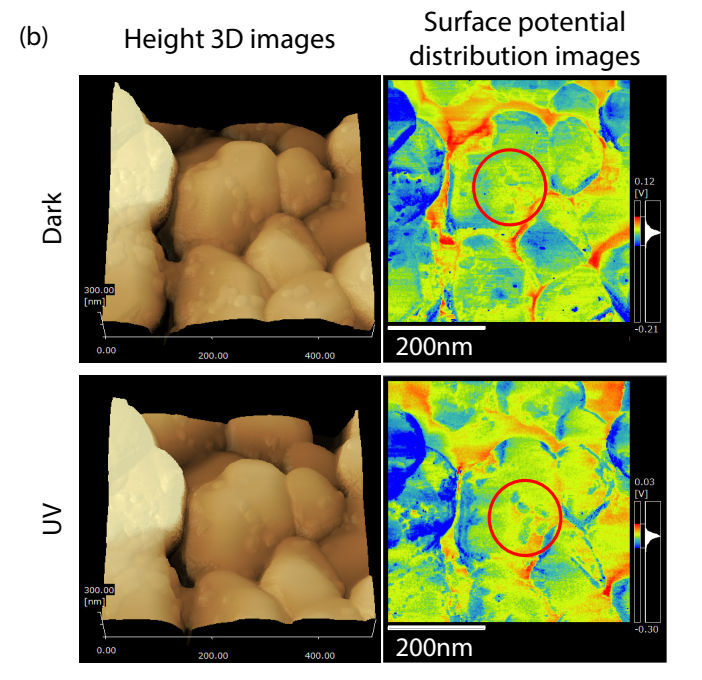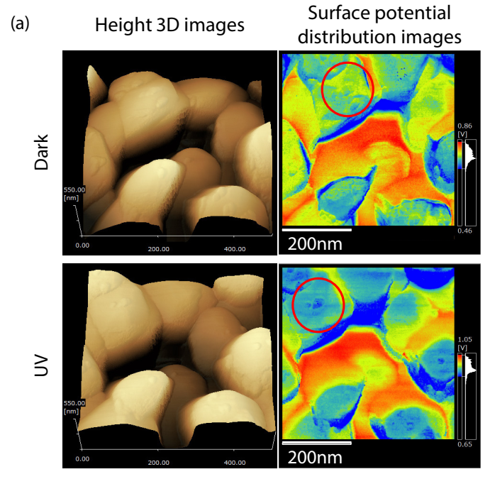 原子力显微镜的开尔文探针力显微镜(KPFM)功能是一种将开尔文定律应用于扫描探针显微镜(SPM)的分析技术,不仅可以测量样品的表面形状,还可以测量样品的表面电位分布。因此,尝试在紫外光照射下对AuNP和复合材料进行表面KPFM扫描,可表征样品表面上的光致电荷分布(电荷分离)。