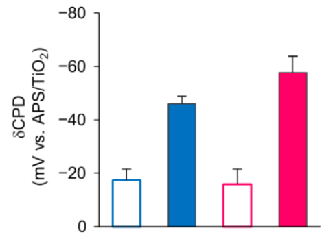 利用生物素-链霉亲和素复合物可将AuNP有效结合到TiO2颗粒表面。设计实验,制备两种样品,一种是没有生物素-链霉亲和素复合物的对照样品,以及使用生物素-链霉亲和素复合物的样品,在照射紫外光及不照射紫外光的条件下,分别测量固定在TiO2上的AuNP的表面电位分布,以可视化光致电荷分布。