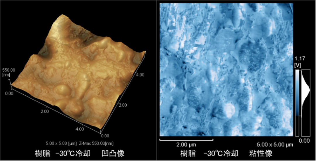 如上图所示,在低温下(-30℃)有机薄膜不仅表面形貌(左侧图)发生了改变,而且低温也影响了样品机械性能,粘弹性(右侧图)相对于常温下明显改变,发生了脆化。