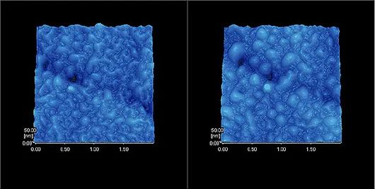 如上图所示,通过控制环境温度和湿度的改变,对树脂样品表面形状变化进行观察。右侧表面(40°C,60%RH)吸收了水份,与左侧表面(28°C,30%RH)相比显得肿胀。