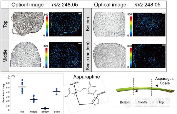 2.芦笋中抗高血压有效成分Asparaptine的分析:使用iMScope TRIO 对芦笋中的Asparaptine 进行了定位分析。Asparaptine的分布方式是从中心向外扩展,从下端向尖端扩展。同时在鳞片和维管束周围分布有大量的Asparaptine。通过借助MALDI-MSI技术,我们成功实现了对一种此前尚不明晰其分布的物质的详细定位信息的分析和确认。