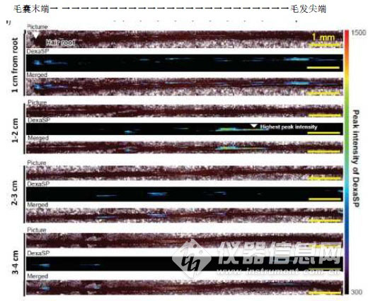 4.马毛中药物成分的直接检测:通过负离子模式分析,成功在马毛中检测出目标药物。给药后的马毛样本中,在距毛囊16.48 mm 位置处观察到较强的药物信号。根据马毛的平均生长速度。可推算出给药时间,大约在24-25天前。由于磷酸酯可在体内迅速代谢,直接在毛发中检测到未变化药物同样是一项十分重要的成果。