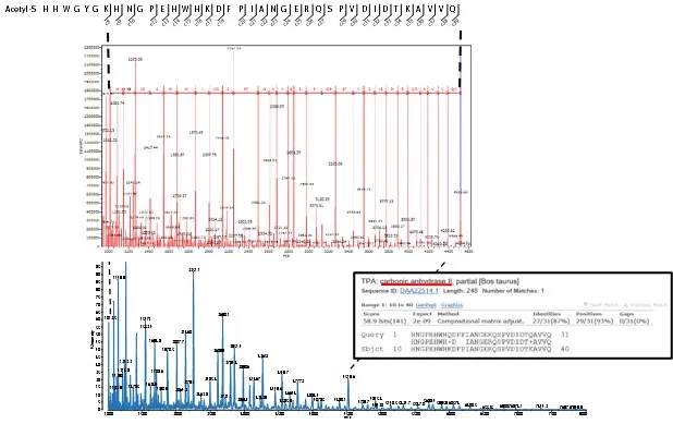 鉴定结果显示匹配结果最高的是碳酸酐酶。通过检测到的c离子片段质量和数据库中已有的碳酸酐酶氨基酸序列,我们可以推断出N段序列是SHHWGYGKH...,并且是N-乙酰化的。