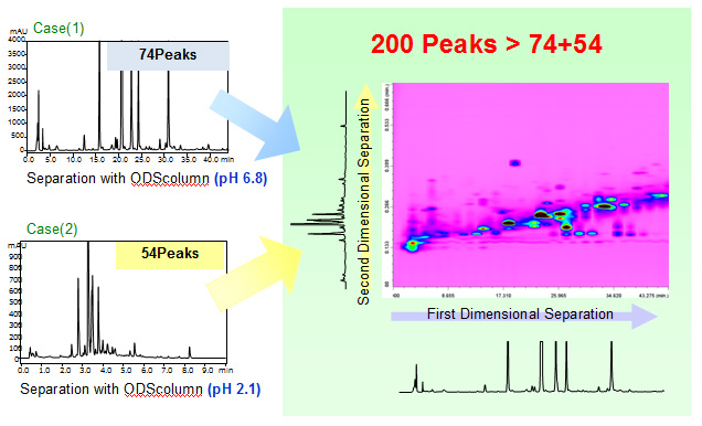 在单一分离系统中重叠的成分可以通过试验2个分离系统实现分离。比如,葛根汤提取物试验1维LC分析时,分析条件(1)下只能确认74个色谱峰,分析条件(2)下只能确认54个色谱峰。而全二维LC可以分离出超过200个色谱峰。