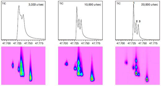为了没有遗漏地检测2维色谱法获得的数量庞大的色谱峰,需要很快的扫描速度。开云手机登录入口·(中国)官方网站公司的UF技术可以满足这一要求。下图是使用GC×GC、扫描速度为3333, 10000, 20000u/sec时取得的数据。UFMS的高速性提高了色谱峰的分离。