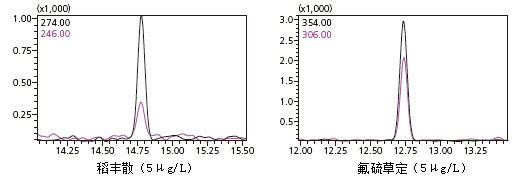 根据标识的设置,将含有致霉异味物质的水质标准值(0.00001 mg/L=10 ng/L)设定为警告浓度值,将水质标准值的十分之一(0.000001 mg/L=1 ng/L)设置为注意浓度值。当出现超过水质标准值十分之一的化合物则以橙色显示,超过水质标准值的化合物以红色显示。通过不同的颜色标识,可简单地对定量结果进行判断。