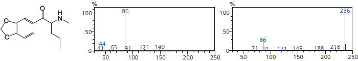隶属于卡西酮类的盐酸盐标准品(3,4-亚甲基双氧苯基甲胺戊酮)的EI质谱图(左)与CI质谱图(右)