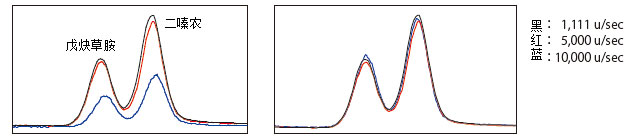 在10,000u/sec 以上的扫描速度下,利用ASSP功能,以高电压加速离子并保持离子信号强度,在全质量范围内抑制了信号强度下降。