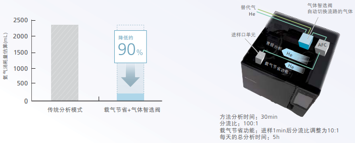 选配“气体智选阀”,常规样品分析时,正常使用氦气,分析结束待机时,可自动切换到其他替代气体 (氮气或氢气),尽可能降低氦气的消耗量,节省实验室气体运行成本。该切换控制功能无缝嵌入到LabSolutions GC工作站中,操作简单直观。
