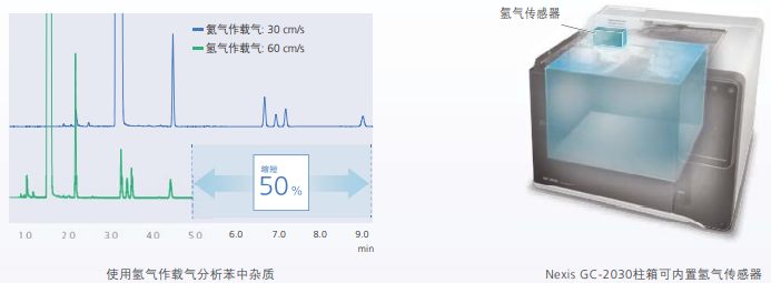氢气容易达到较高的线速度水平,从而实现更好的分离,而且氢气在进样口压力波动上比氦气更小,因此氢气对高速分析来说是一种理想的载气选择。Nexis GC-2030可内置氢气传感器,通过对潜在泄漏的及早发现来保证使用安全,同时可以在氢气泄漏时主动关闭主机电源避免发生事故。