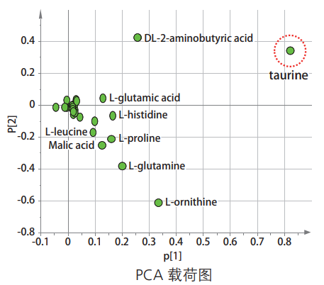 在该例实验中,代谢产物(26种组分)如氨基酸,有机酸和糖的离子对参数用于小鼠肝脏的代谢组学分析。 参照LC/MS初级代谢产物方法包中的一些分析条件,可以轻松进行代谢组学分析。 使用DPiMS-8060系统测定由四氯化碳诱导急性肝损伤模型组和对照组小鼠组织中的主要成分。基于牛磺酸对PCA载荷图中群组分离的显著贡献,在模型组和对照组之间观察到显著差异(Welch't检验结果p<0.001)。该差异在箱线图中得到了验证。
