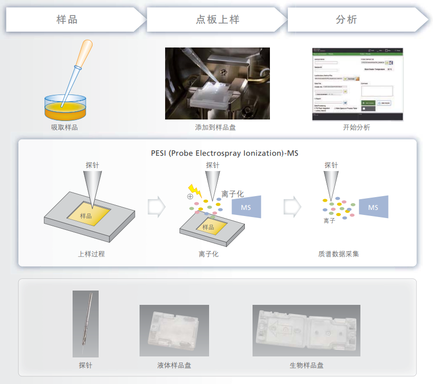 PESI(Probe Electro Spray Ionization)TQ离子源可以作为选配件,轻松替换ESI离子源,与LC/MS/MS联用。将其安装在LCMS-8045/8050/8060/8060NX系统中,以便在PESI TQ和ESI单元之间轻松切换。它只需极其简单的预处理即可快速检测血液或组织样本中的药物或代谢物,使其成为简单筛选应用的理想选择。
