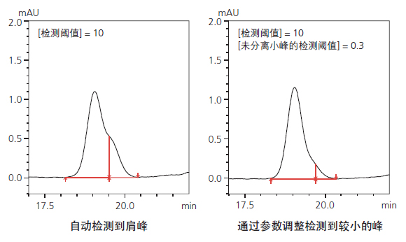 即使在高噪声的复杂色谱图中,i-PeakFinder功能也可以自动识别色谱峰,并考虑基线漂移等因素获得更高的积分精度。通过调整i-PeakFinder的参数,例如峰值检测阈值等,则可检出更低强度的色谱峰。