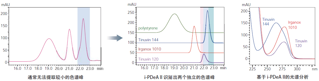 此外,i-PDeA II 功能在之前版本的基础上进一步优化,能够更好地量化没有被色谱柱充分分离的组分/峰。通过简单地设定 LabSolutions中的时间和波长参数来实现色谱峰分离。