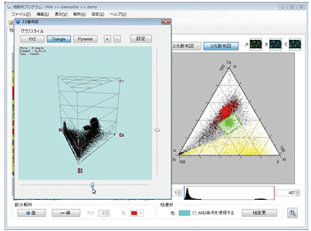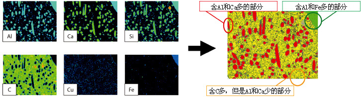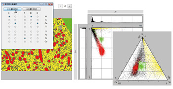 根据元素相关关系,从各元素的面分析数据中选择2或3个元素建立散布图,用不同颜色来区分元素间的特定关系。另外,通过多个散布图同时显示,可以看出多元素之间的关联。