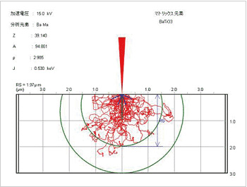 通过模拟可以知道入射电子束通过样品表面进入到样品的深度及宽度。计算X射线侵入范围的方法2种,分别为根据电子束扩散大小、分析范围求出电子能级,以及根据每个电子轨迹得出所以电子轨迹(侵入范围)的蒙特卡洛法。