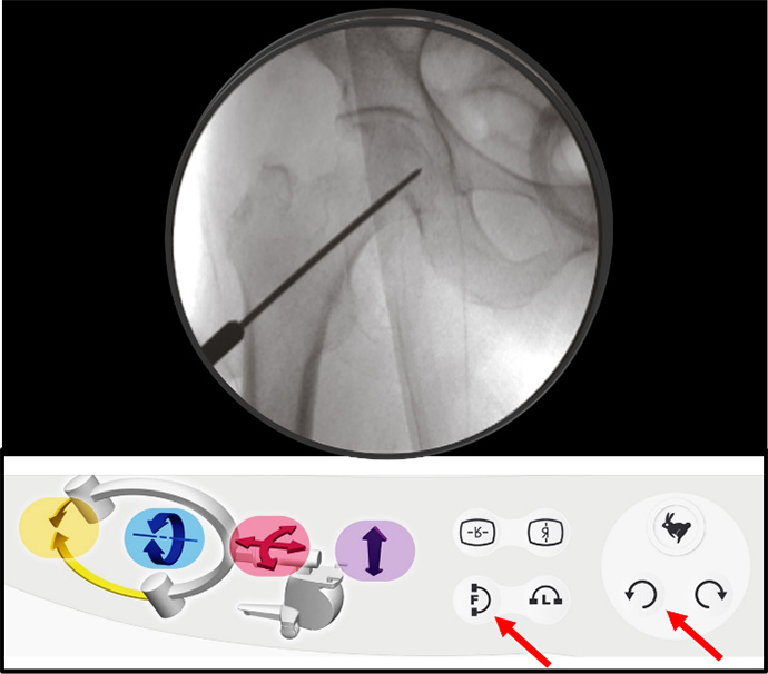记忆键是一项非常有价值的功能键,一般手术过程中需要经常从正面和侧面两个固定的位置进行透视定位(如骨折定位、穿刺等),并且两个位置需要多次往返。记忆键可以在检查过程中重复相同的CCD相机旋转角度、准直器位置、曝光条件等。该功能对于股骨头下骨折等需要重复相同投照角度的检查非常有价值。可明显缩短检查时间、提供工作效率。