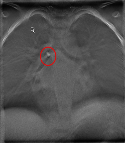 ![]() 3岁儿童断层融合提示侧支气管分叉处可见一高密度影 |