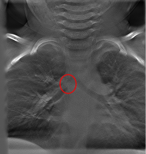 小儿各种不慎原因可导致支气管异物的发生,断层融合可以较为容易地发现异物所在支气管的位置,从而有助于临床科室进行异物取出的操作定位。
