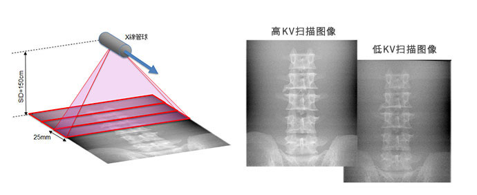 使用大容量X线球管进行高速脉冲扫描,在X线球管快速移动扫描,X线KV高低切换的同时,X线束成狭缝状。大大提高采集精度及速度。