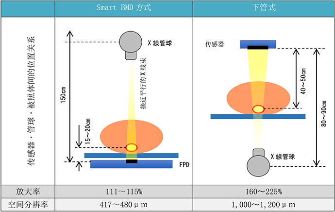 由于测量部位与X射线源的距离较远,因此可以控制减少放大率,提高骨密度测量精度。